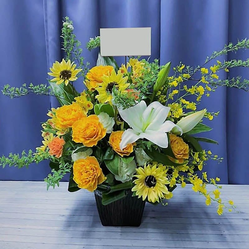 | 季節の花をメインにユリを入れておまかせで制作いたします。(ユリの色、本数はおまかせになります。) |