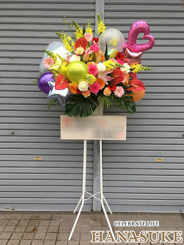 初めてスタンド花を注文しましたが、とても素敵な仕上がりで、感動しました! サイドのハートバルーンや、中央下にリボンバルーンがあり、とても可愛いかったです! またお願いしたいと思います。